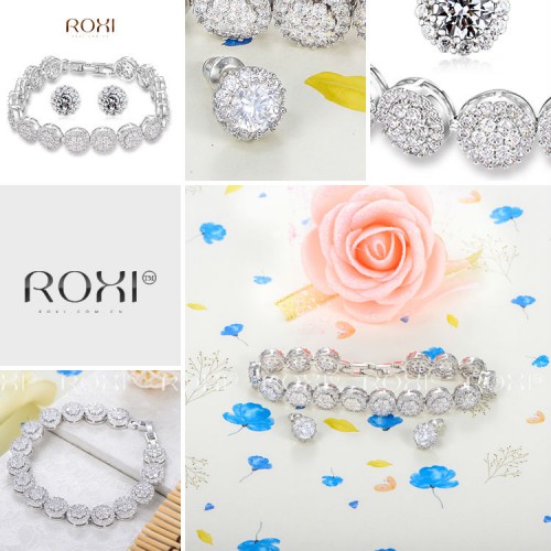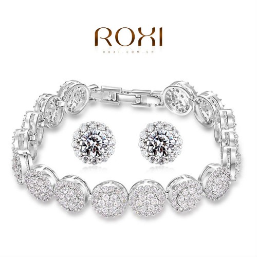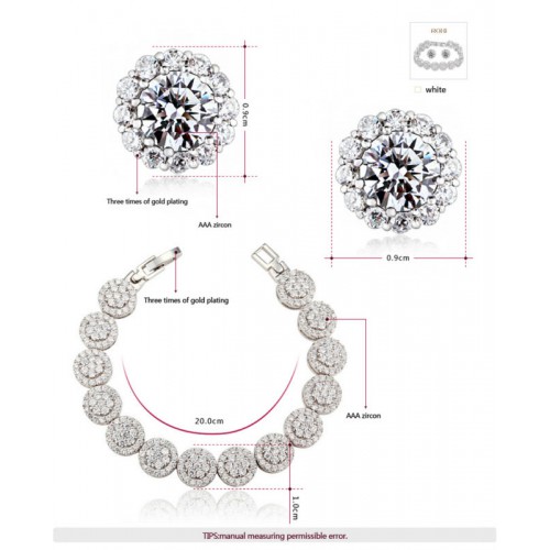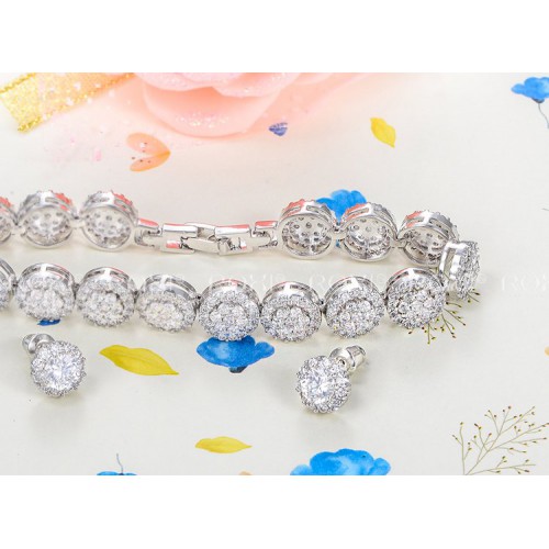 Набор изысканных украшений, состоящий из сережек и браслета  Все изделия набора инкрустированы цирконом и обработаны белым золотом, нанесенным в три слоя.